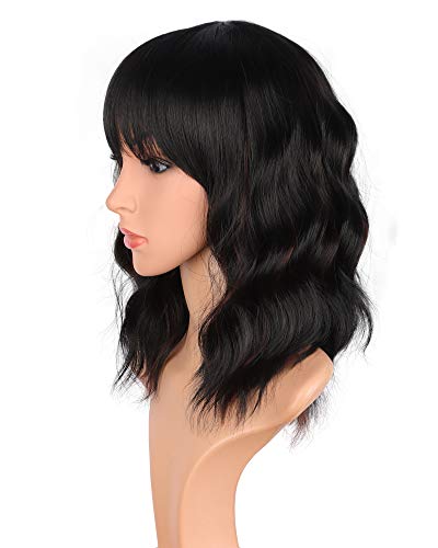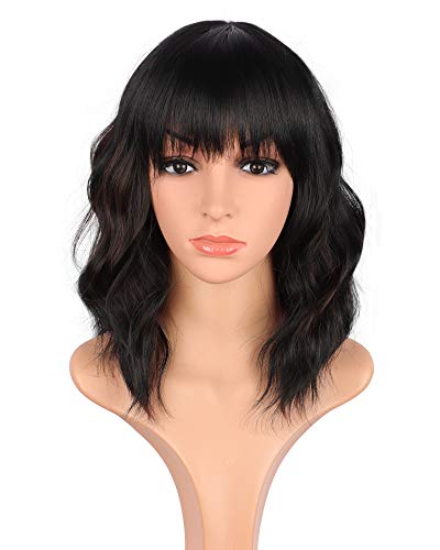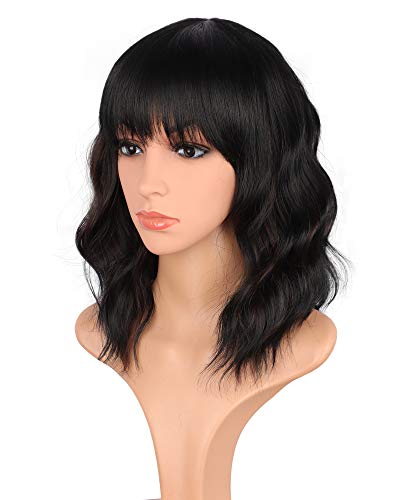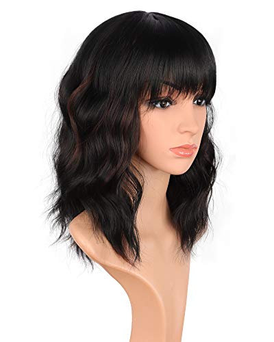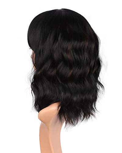 14 inch Shoulder length wavy wigs with bangs for black women natural looking short curly synthetic hair wigs heat resistant (Black mix Brown-02)