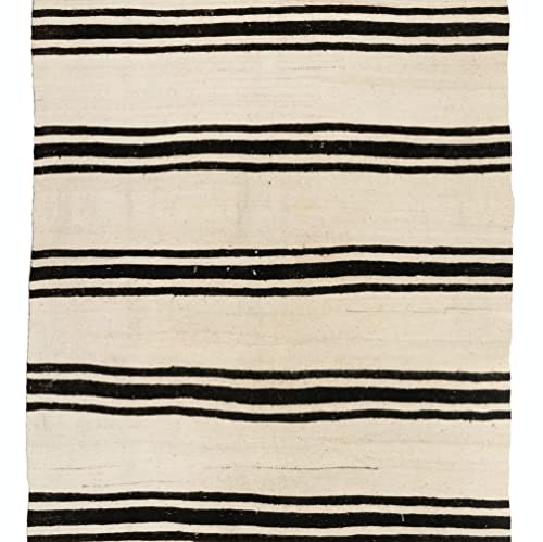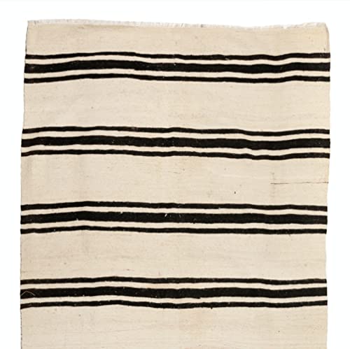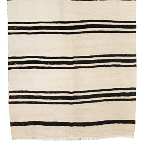 4.4×13.8 Ft Banded Vintage Turkish Runner Kilim in Cream and Black Colors. 100% Wool. Reversible. C1295