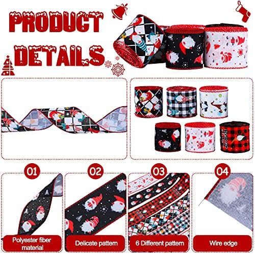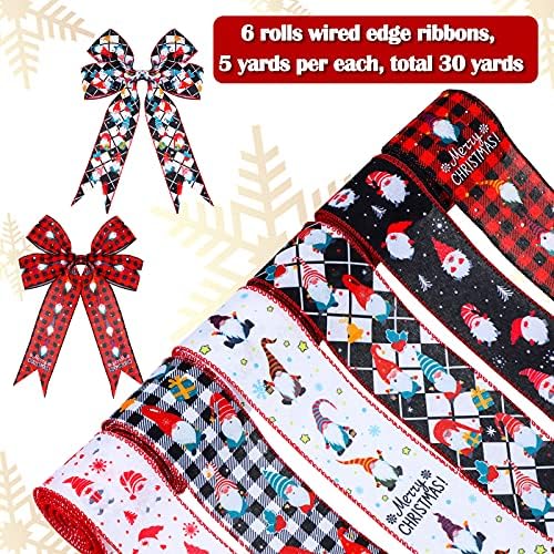 6 Rolls 30 Yards Christmas Gnome Ribbon Christmas Wired Edge Ribbon 2.5 Inch Wide Check Gnome Ribbon for Christmas Party Wreaths Wrapping Floral Arrangements DIY Crafting Supplies, 6 Styles