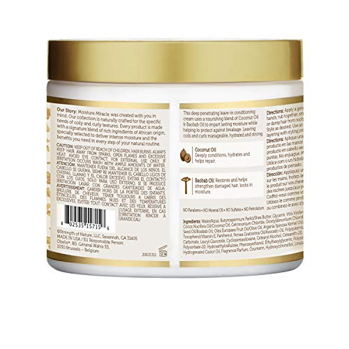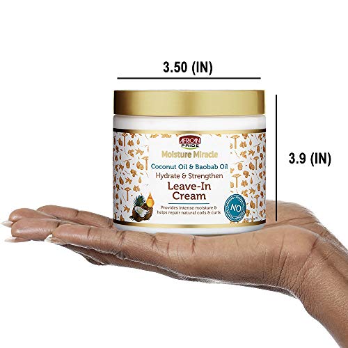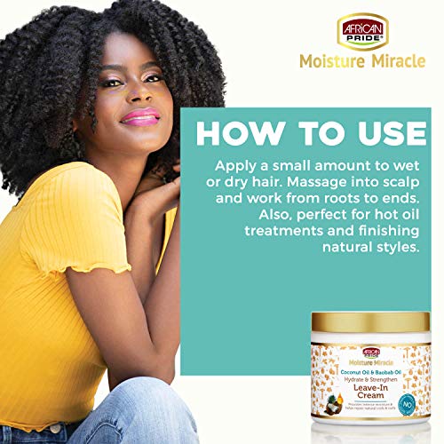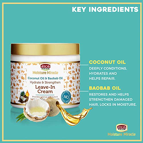 African Pride Moisture Miracle Coconut Oil & Baobab Oil Leave-In Cream moisturizes hair using a nourishing blend of baobab & coconut oil to add lasting hydration while protecting against breakage; leaving hair strong.