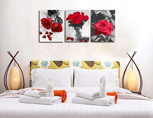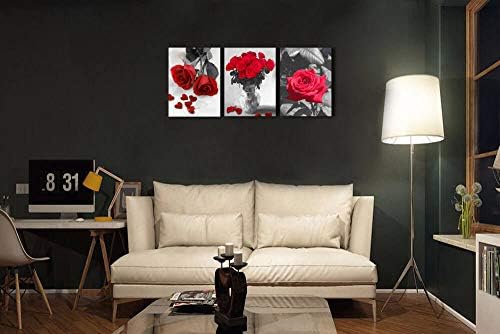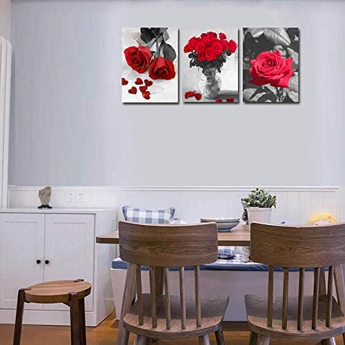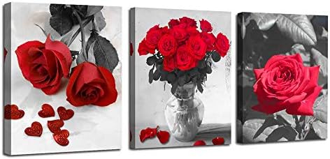 Canvas Wall Art Red Rose 3 Panels Flowers Pictures Prints Black and White Painting Modern Romantic Florals Framed for Bathroom Kitchen Bedroom Decor