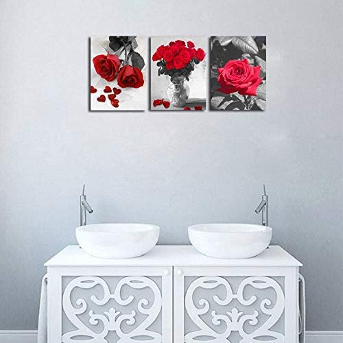 Ardemy Canvas Wall Art Red Rose 3 Panels Flowers Pictures Prints Black and White Painting Modern Romantic Florals Framed Ready to Hang for Bathroom Kitchen Bedroom Washing Room Spa Wall Decor