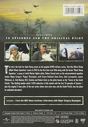</span><p><span>The sky’s the limit for high-flying action as the popular WWII military series, Baa Baa Black Sheep (Black Sheep Squadron), comes to DVD for the first time ever! Ride along with the heroic “Black Sheep Squadron,” a group of misfit Marine fighter pilots. Robert Conrad stars as the unconventional squadron leader, Major Gregory “Pappy” Boyington, with Simon Oakland, Dana Elcar, John Larroquette, James Whitmore Jr., Dirk Blocker, W.K. Stratton and Robert Ginty as the pilots known as the “Terrors of the South Pacific.” This thrilling double-sided 2-DVD collection is fully loaded with the first 10 episodes of Season 1, plus the original 2-hour pilot, of the war series where men were men, and the South Pacific was the place for unlimited adventure!</span></p><span><br/>Bonus Content:<br/></span><p><span class=”a-text-bold a-text-italic”>Disc 2:</span><span><br/> </span><ul class=”a-unordered-list a-vertical”><li><span class=”a-list-item”><span>From the NBC News Archives: Interviews with Major Gregory Boyington</span></span></li></ul><span>