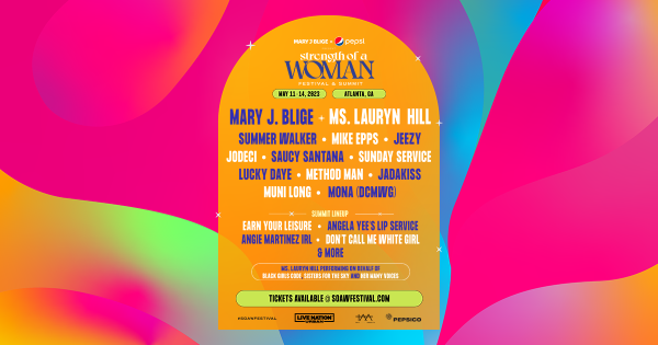 (Black PR Wire) Strength of a Woman Festival & Summit Returns To Atlanta With An All-Star Lineup Including Mary J. Blige, Lauryn Hill, Summer Walker, Robert Glasper, Mike Epps, Jodeci, Busta Rhymes, Jeezy, Method Man, Jadakiss, Lucky Daye, Coco Jones, Saucy Santana, Sunday Service Collective and Muni Long Mary J. Blige and Pepsi proudly announce the second annual Strength of a Woman Festival and Summit in partnership with Live Nation Urban. The festival returns to the vibrant city of Atlanta, GA with four days devoted to music, comedy, female empowerment and community building between May 11th -14th, 2023. Presale tickets go live TODAY at NOON ET with code SOAW23, while general on-sale begins Friday, March 10th at 10AM ET. For tickets, visit: www.soawfestival.com.