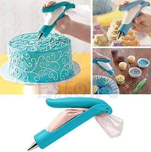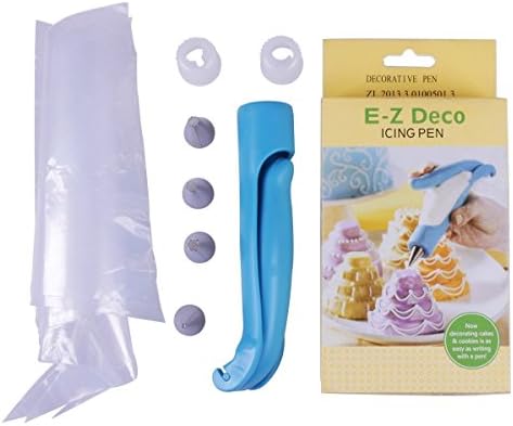 Color:Blue Material: ABS+metal Size:6.3*4.1*1.4 inches Package:1* Decorating pen+ 4*Decorating bags+ 4*Different shape tips + 2*Couplers Now you can decorate cakes as easily as if you’re writing with a pen.Easy to use ,create any pattern any you like You do not need to be a pro to decorate cakes,cupcakes,cookies, or fondants that look good enough to come from the Cake Boss bakery.