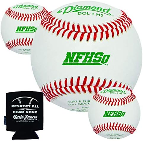 Diamond DOL-1 HS High School Baseball. Three (3) dozen baseballs. Includes premium leather and Diamond Raised Seam, cork and rubber pill, set includes Rods Sports Insulated Can Sleeve. Approved by the NFHS National Federation of State High School Associations. Approved Ball – NOCSAE Stamp. Recommended for Game or Practice.