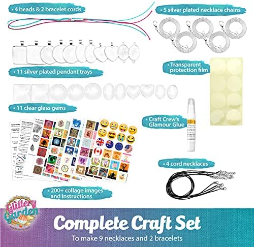 11 silver plated pendant trays11 clear glass gems5 silver plated necklace chains4 cord necklaces4 beads & 2 bracelet cordsCraft Crew’s Glamour GlueTransparent protection film200+ collage images and Instructions