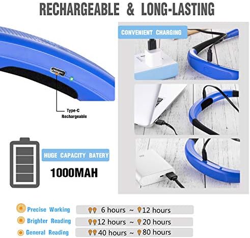 [Eye Caring & Ergonomic Design] No flickering and blue light filter design with advanced LED beads. No eye strain any more for both kids and adults. The arms are supple and adjustable so you can get the angle most comfortable to you. Ergonomic neck around design, and it is totally hands free!