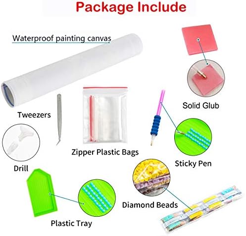 1*HD oil painting canvasFull set of colored round diamonds2*Point diamond pen2*Diamond tray1*Clay1*Tweezers5*Ziplock bag