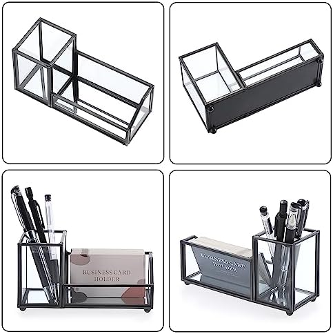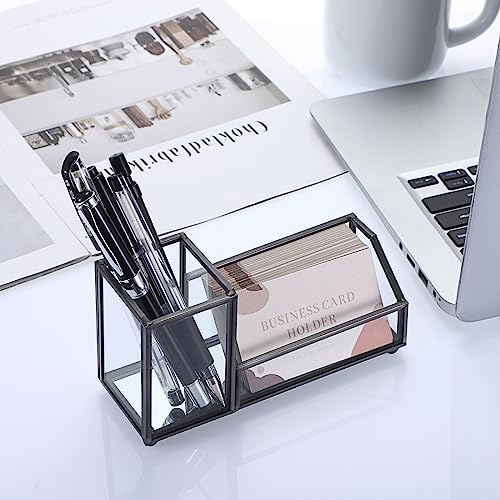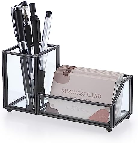 Hipiwe Clear Glass Business Card Holder with Pen Holder Cup