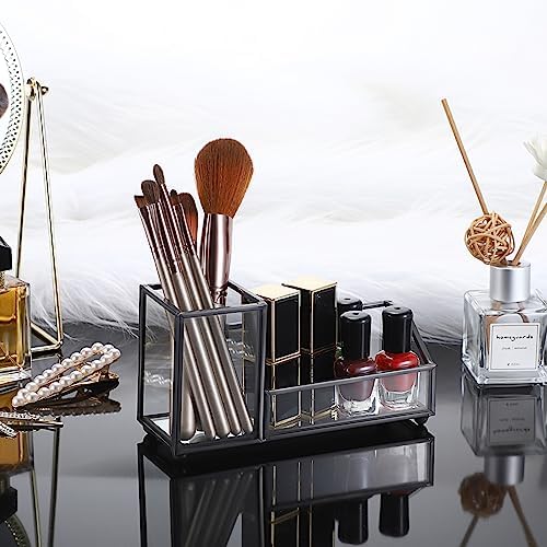 Hipiwe Glass Business Card Holder Metal Pen Pencil Storage Holder for Desk Clear Business Card Display Organizer Case for Office Home,2 Slots,Black