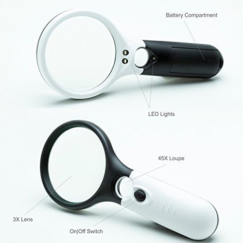 Package INCLUDES … Handheld 3x Magnifying Glass with Light and 45x lighted Loupe Cloth Storage Bag, Microfiber Cleaning Cloth and FREE BONUS