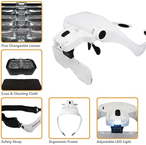 MagniPros LED Illuminated Headband Magnifier Visor with Bonus Cleaning Cloth and 5 Detachable Lenses 1X, 1.5X, 2X, 2.5X 3.5X – (Upgraded Version) Hands-Free Head Worn Lighted Magnifying Glass