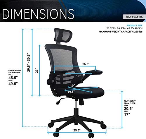 The Techni Mobili Modern High Back Mesh Executive Chair has a sleek, contemporary design and features breathable open mesh back support, a contoured fabric seat cushion, height-adjustable headrest, padded flip-up armrests, and the reclining back has a locking lever and a tension control knob. Dual wheel non-marking casters and 5-point heavy-duty polished nylon base provide durable, stable mobility. It is ready and easy to assemble . Includes a 2 Year Warranty. Weight Capacity: 220lbs