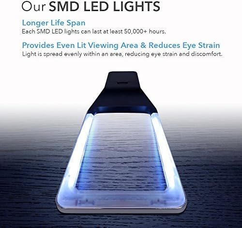 Equipped with 10 DIMMABLE & Energy-Efficient SMD LED lights built surrounded the frame which provides more evenly lit viewing area, brightness can be adjusted from 0% to 100% with dial switch. These LEDs can last for more than 20 years without Burning out or Overheating.The Brightness level peaks at 600 Lumens making it the Brightest handheld magnifying glass on the market.