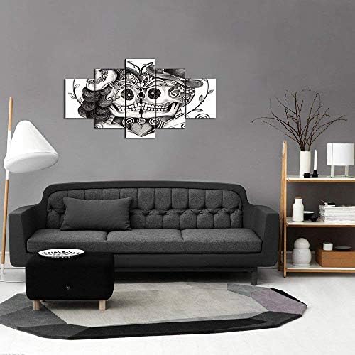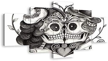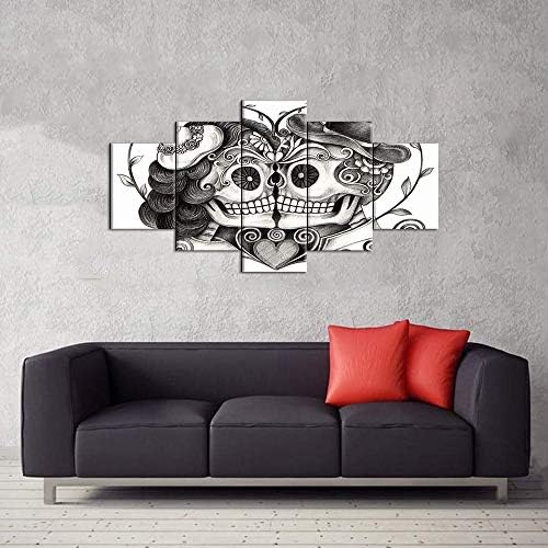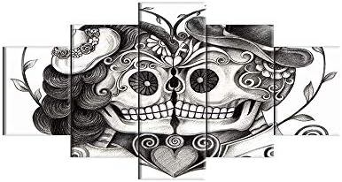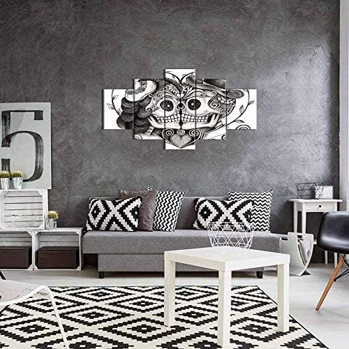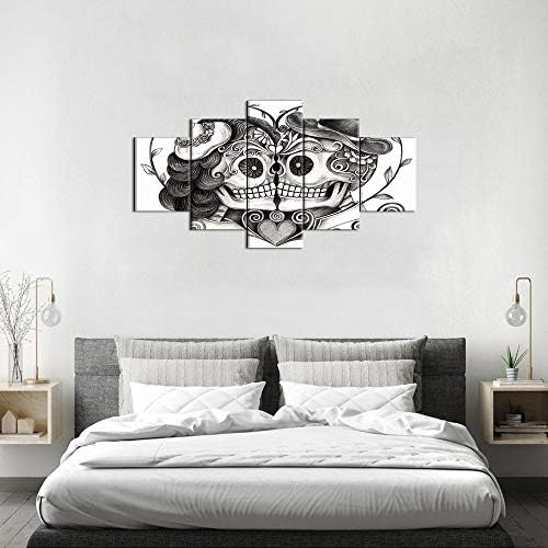 Skull Head Couple Love With Flower In Eyes Human Canvas Wall Art Black White Print Home Decor for Living Room Contemporary Pictures 5 Panel Large Poster Decal Painting Framed (60″Wx32″H, Artwork-09)