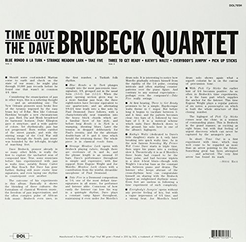 Dave Brubeck Quartet: Dave Brubeck (piano); Paul Desmond (alto saxophone); Eugene Wright (bass); Joe Morello (drums). Recorded at Columbia 30th Street Studios, New York, New York on June 25, July 1 & August 18, 1959. Includes liner notes by Dave Brubeck and Steve Race. Dave Brubeck’s TIME OUT ranks alongside Miles Davis’ KIND OF BLUE as one of the few advanced jazz masterpieces to achieve great commercial success. In fact, the widespread popularity of TIME OUT, with its cool-toned ambience, smooth style, and elements borrowed from classical music, helped make modern jazz a mainstream phenomenon. The ubiquitous “Take Five” may be overplayed, but that doesn’t diminish the joy of its complex melodic hooks, its perfectly executed solos, or the swinging slink of its 5/4 signature. “Blue Rondo a la Turk” collages Mozart, cool swing, and Brubeck’s own classically oriented piano style, and the airy, delicate “Everybody’s Jumpin'” showcases the lyrical splendor of saxophonist Paul Desmond. With bassist Gene Wright and drummer Joe Morello keeping the tricky rhythms agile and swift, the Dave Brubeck Quartet blended complexity and accessibility for pure jazz pleasure on TIME OUT, an album everyone should own.