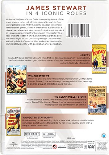 Universal Hollywood Icons Collection spotlights one of the most diverse actors of all time, James Stewart, in four unforgettable roles. With the ability to adapt to so many different film genres, Stewart entertained audiences as a simple man whose best friend is a six-foot-tall imaginary rabbit in Harvey, a determined frontiersman in Winchester ’73, a real-life band leader in The Glenn Miller Story and a pilot on a wild flight in You Gotta Stay Happy. Discover the enduring talent of an actor that audiences continue to immediately identify with generation after generation.