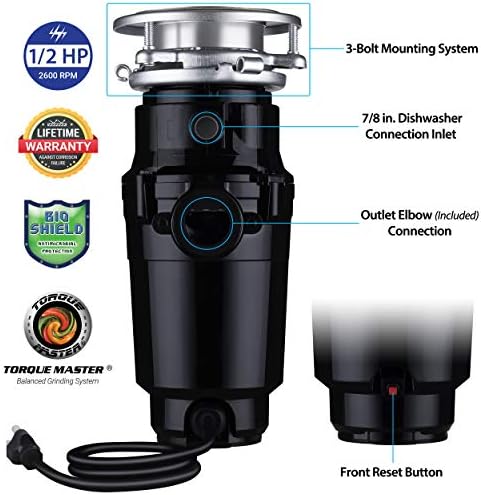 PERMANENT MAGNET MOTOR: The garbage disposal features a 1/2 horsepower 2600 RPM permanent magnet motor with anti-jam stainless steel impellers and operates on 120V 60Hz power. The power cord comes attached and is about 3 feet long