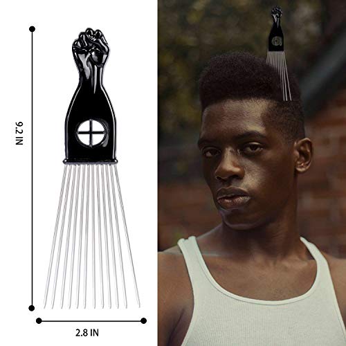 Made of metal material, reinforced teeth,don’t rust, durable for a long timeClassic black fist design; Adorable comb handleAfro Pick has wide and extra-long teeth ,no worry to hurt your scalp and hairPerfect for curly hair and Afro hairstyle